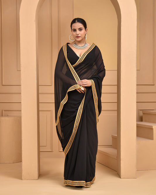 Beige and Blue Georgette Gota Pre -Drapped Saree
