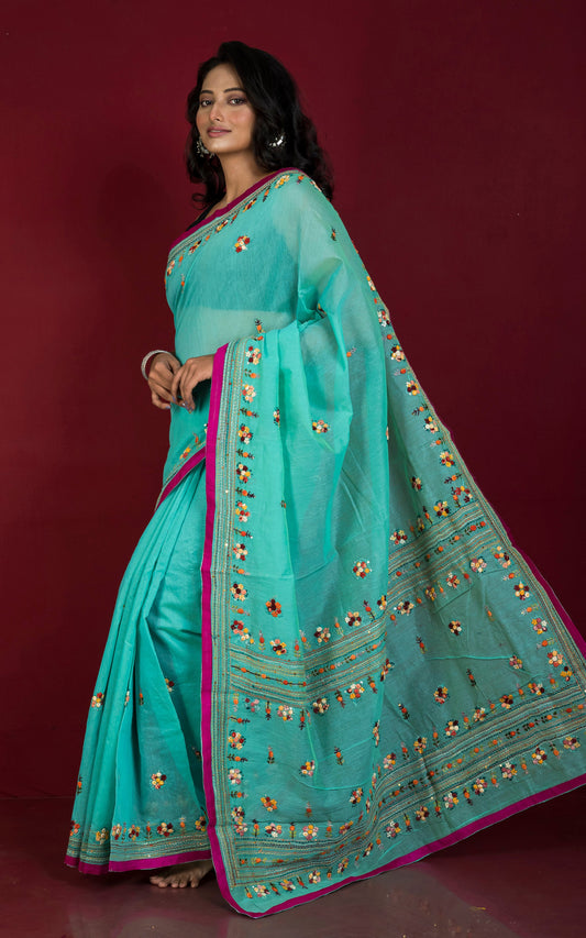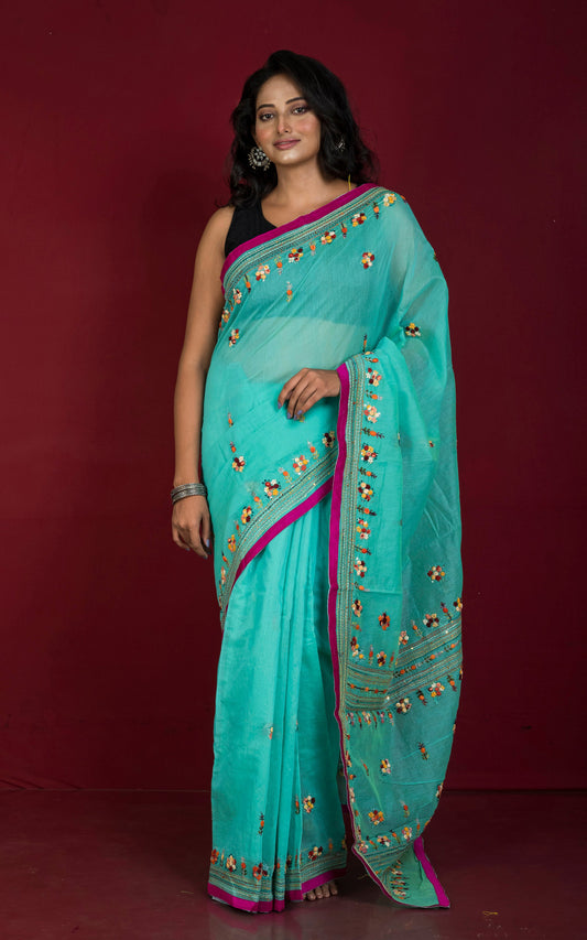 Embroidery Work Soft Kosa Silk Saree in Phthalo Green, Beige and Multicolored