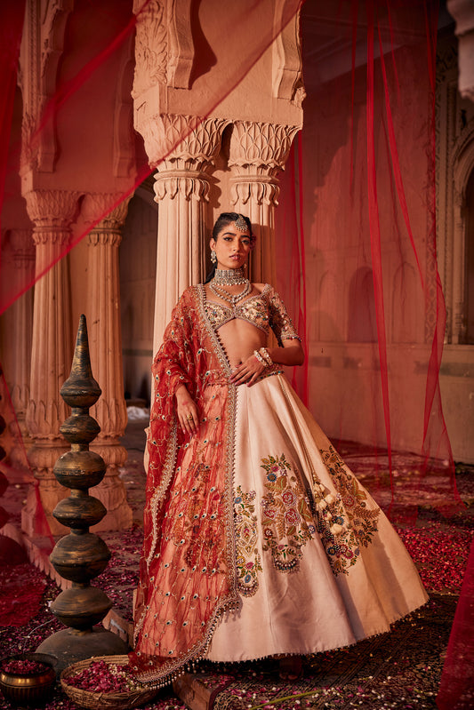 Ivory Raw Silk Hand & Machine Embroidered Lehenga Set