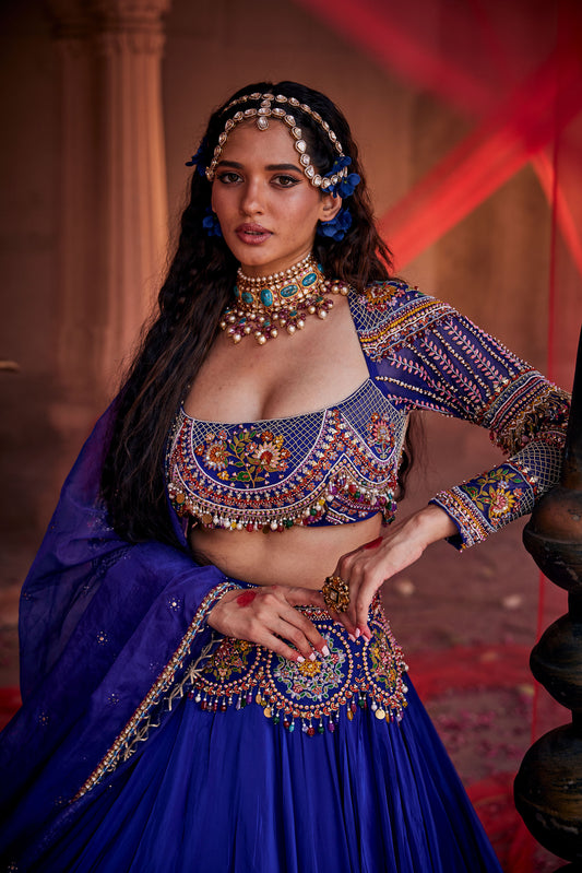 Bridal lehengas typically pair well with traditional Indian jewelry such as Kundan, Polki, or Gold sets embellished with pearls, gemstones, Polki, Pearl Chhapka, Golden Meenakari or intricate detailing. These pieces complement the richness of the lehenga while adding a touch of elegance to the overall bridal ensemble.