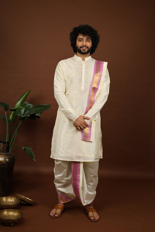 Kanjivaram off white hand emboirdered Pattu kurta set