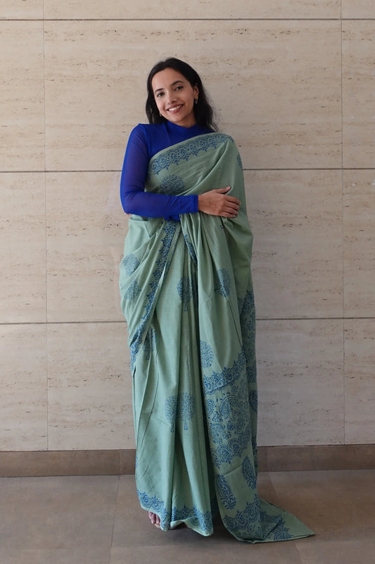 Green Flag in Love - Plain Natural Dyed - Plain Mulmul Cotton Saree