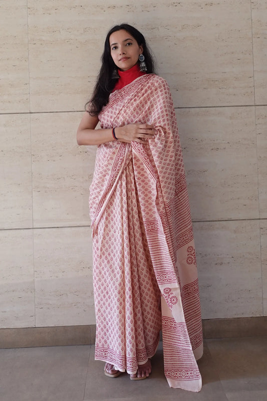 10% off availableCreamy Canvas - Handblock Print Natural Dyed - Beige Mulmul Cotton Saree