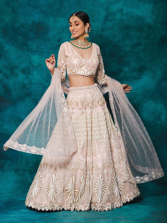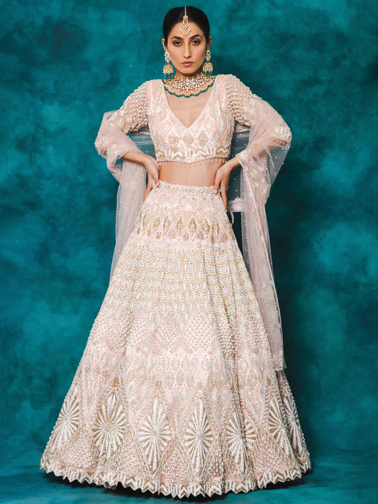Blush Pink Color Stones & Pearls Embroidery Net Bridal Lehenga