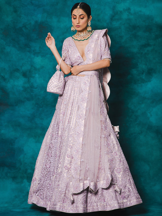 Lilac Color Stones & Pearls Embroidery Net Bridal Lehenga