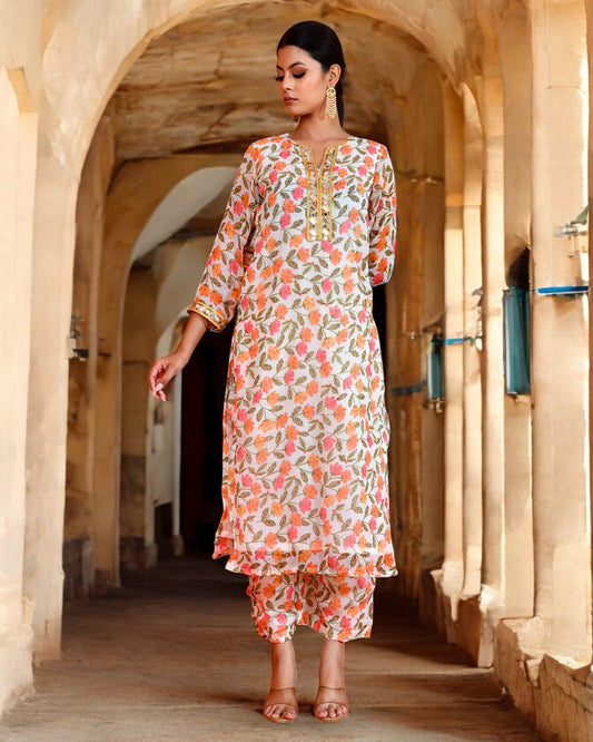 Ivory Tissue Georgette Aari Embrodidery Kurta & zari embelllished Dupatta Set