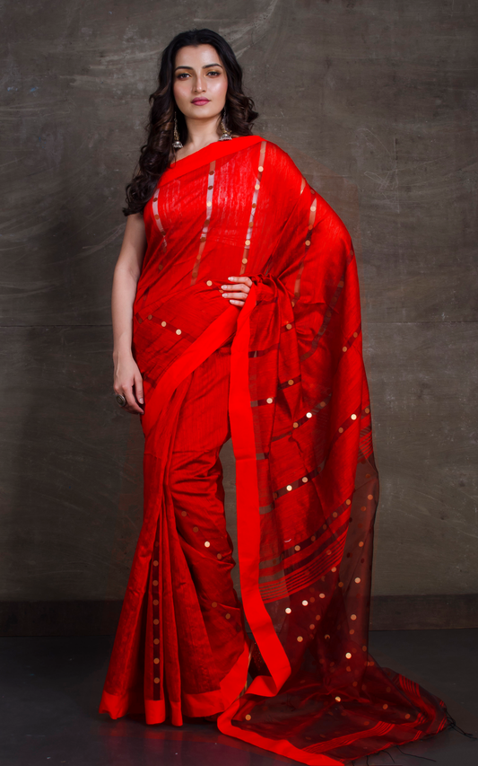 out of stockCotton Linen Banarasi Saree in Red and Gold