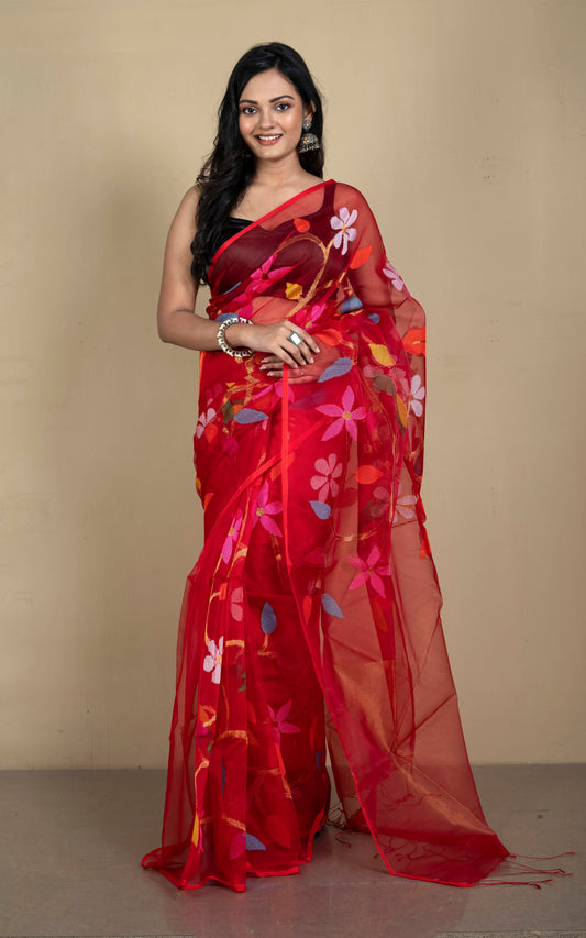Peacock and Floral Motif Work Muslin Silk Jamdani Saree in Natural Red, Golden and Multicolored Thread Work