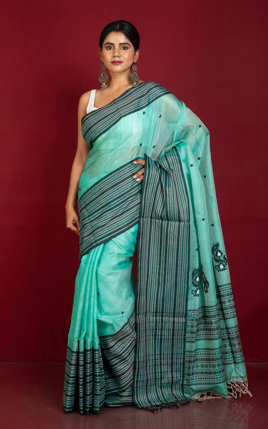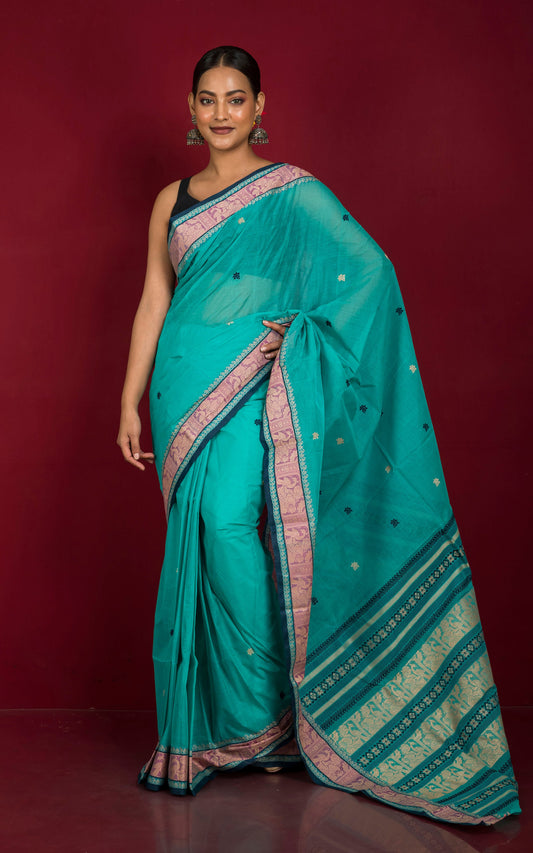 Bengal Handloom Cotton Baluchari Saree in Sea Green, Pastel Purple, Beige and Black