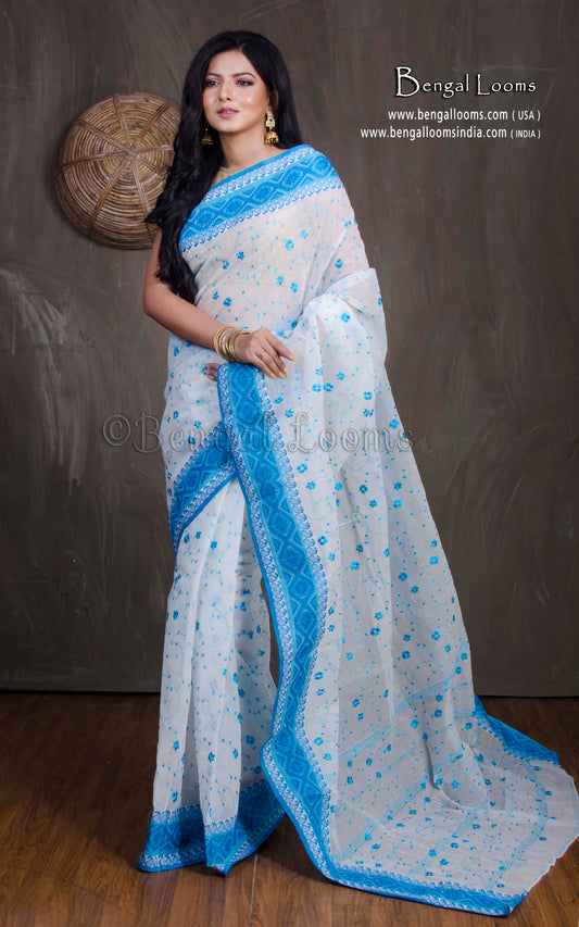 Authentic Soft Silk Muslin Jamdani Saree in Dark Blue, Copper and Multicolored Meenakari Work