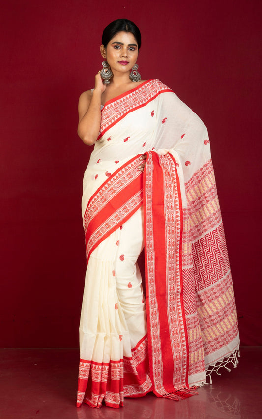 Sholapuri Self Work Contrast Border Cotton Muslin Jamdani Saree in White, Red and Gold