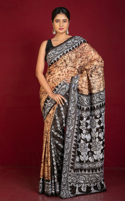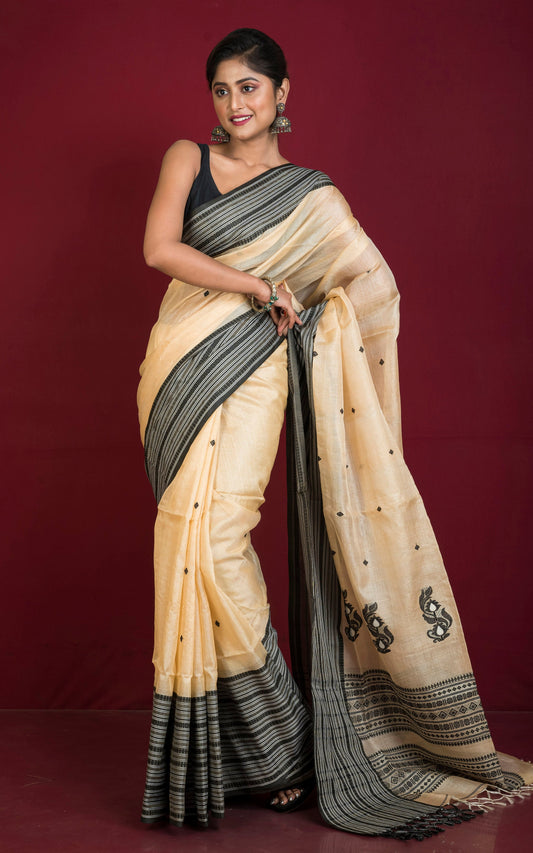 Pure Handloom Gicha Tussar Saree in Natural Tussar Color and Charcoal Black