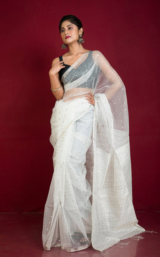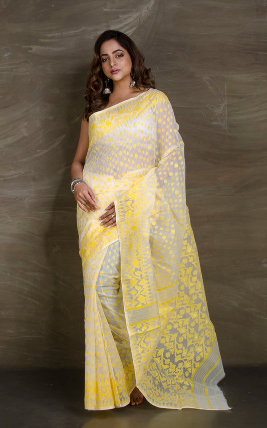 Sholapuri Work Jamdani Saree in Off White and Pastel Yellow