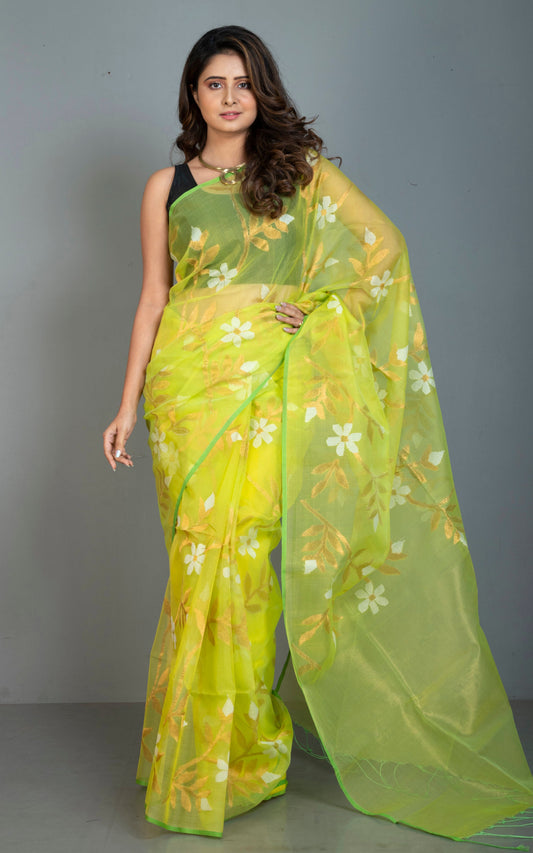 Hand Karat Work Muslin Jamdani Saree in Lime Green, Bright Yellow, Magenta and White