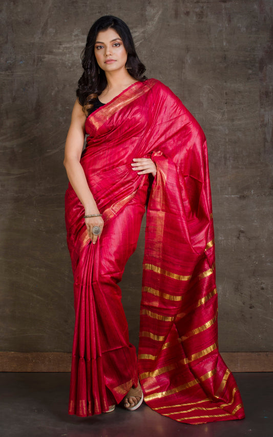 Gicha Tussar Silk Saree with Woven Gold Bands Pallu in Red and Golden