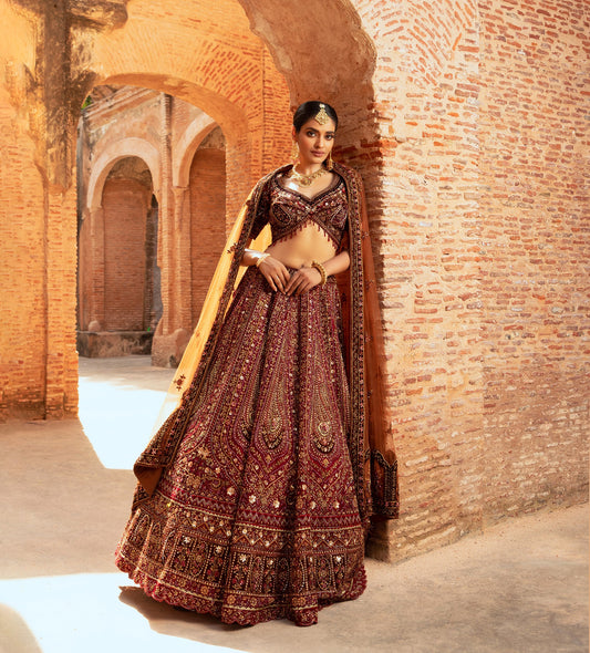 Maroon Net and Velvet Hand-Embroidery Bridal Lehenga