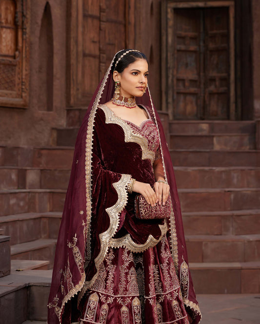 Maroon Net and Velvet Hand-Embroidery Bridal Lehenga