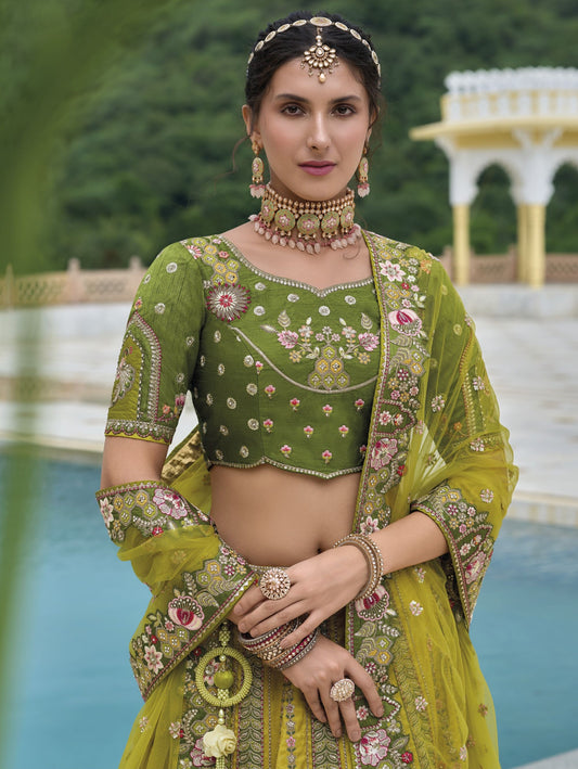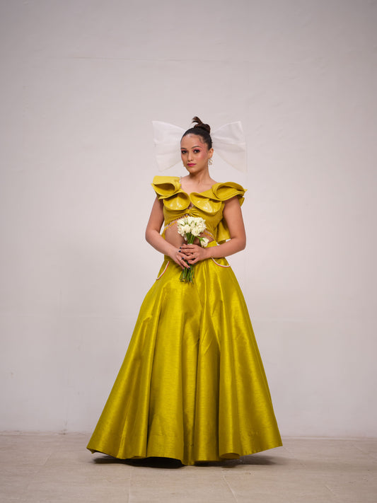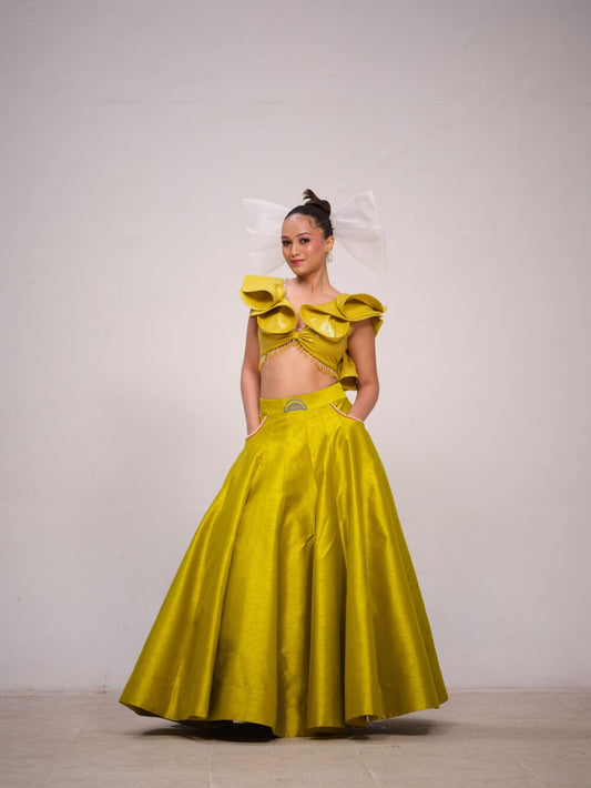 Yellow-Green ombre soft silk saree with yellow unstitched blouse