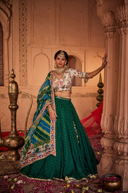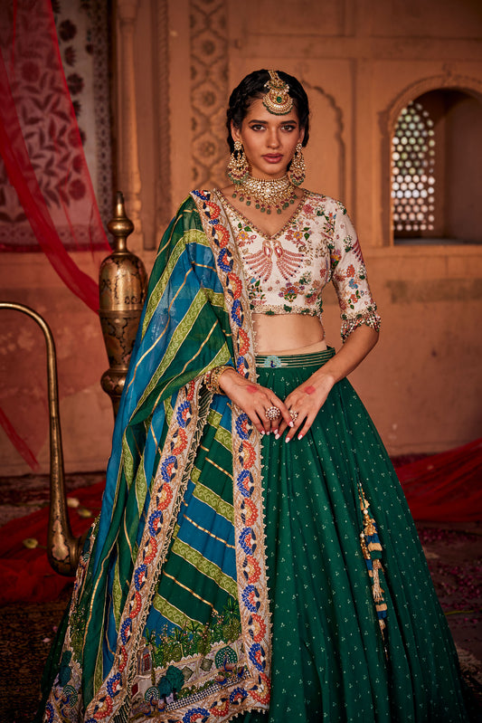 Bridal lehengas typically pair well with traditional Indian jewelry such as Kundan, Polki, or Gold sets embellished with pearls, gemstones, Polki, Pearl Chhapka, Golden Meenakari or intricate detailing. These pieces complement the richness of the lehenga while adding a touch of elegance to the overall bridal ensemble.
