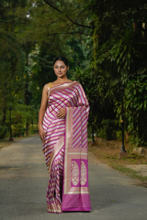 Banarasi sarees boast a rich variety of patterns, each reflecting intricate craftsmanship and timeless elegance. Common patterns include floral motifs like butidar (small flowers), jaal (net-like patterns), bel (creeping vines), and jhummar (paisley). Additionally, geometric designs such as checks, stripes, and diagonal patterns are popular choices. Traditional motifs like peacock, elephant, and mango are also prevalent, adding cultural significance to the saree. With Banarasi sarees, one can explore a myriad of patterns, each telling a unique story of artistry and tradition.