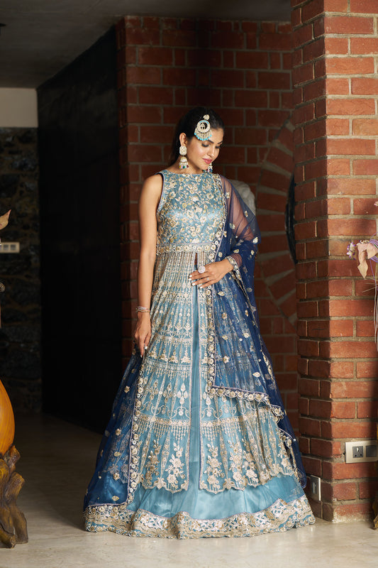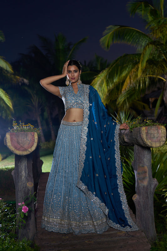Royal Blue Butterfly Net Sequins & Tone to Tone Cotton Thread Work Sangeet Lehenga