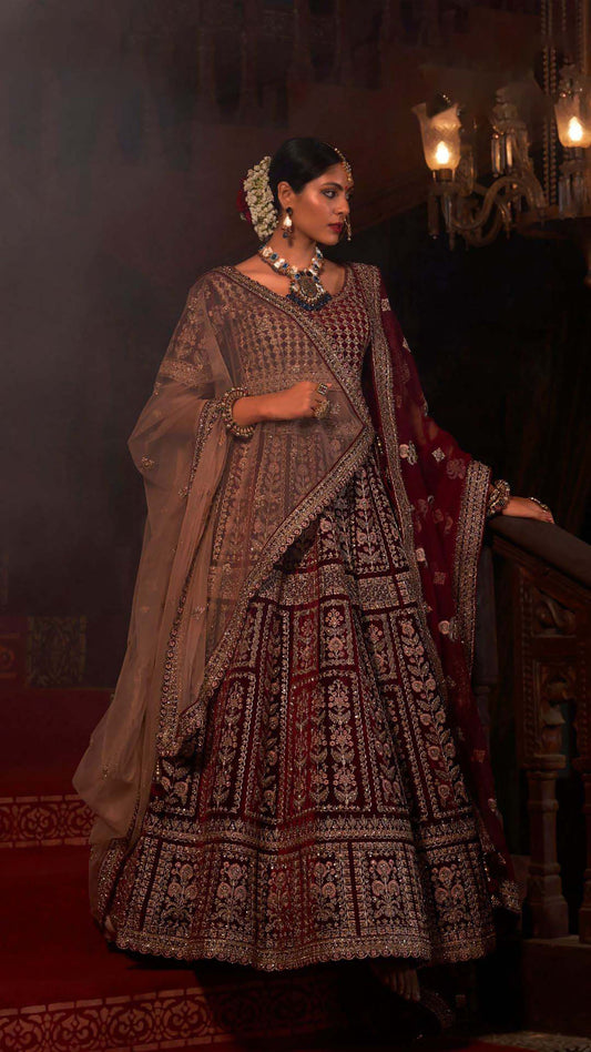 Maroon Net and Velvet Hand-Embroidery Bridal Lehenga