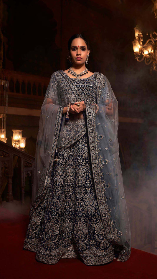 Ice Blue Soft Net Thread Embroidered Wedding Guest Lehenga