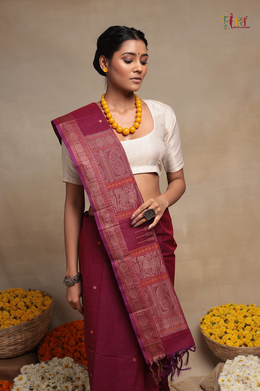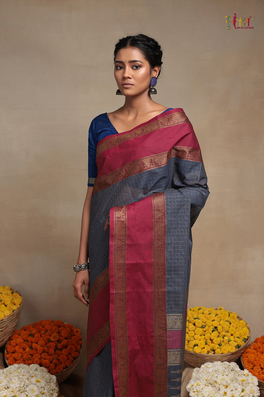 Kanjivaram Silk Sarees are magnificent creations by the skilled weavers from the town of Kanchipuram in Tamil Nadu, India. Celebrated as the Queen of Sarees, Kanjivaram sarees are renowned for their elegance, luster, and authenticity. In the 15th century, the distinguished weaving communities of Andhra Pradesh, the Devangas and Saligars, migrated to Kanchipuram and began crafting Kanjivaram sarees with designs that drew inspiration from temple sculptures.