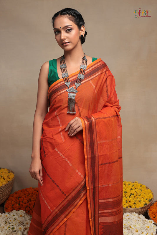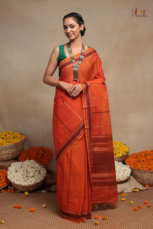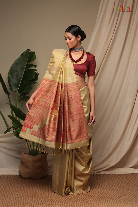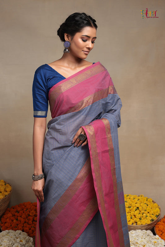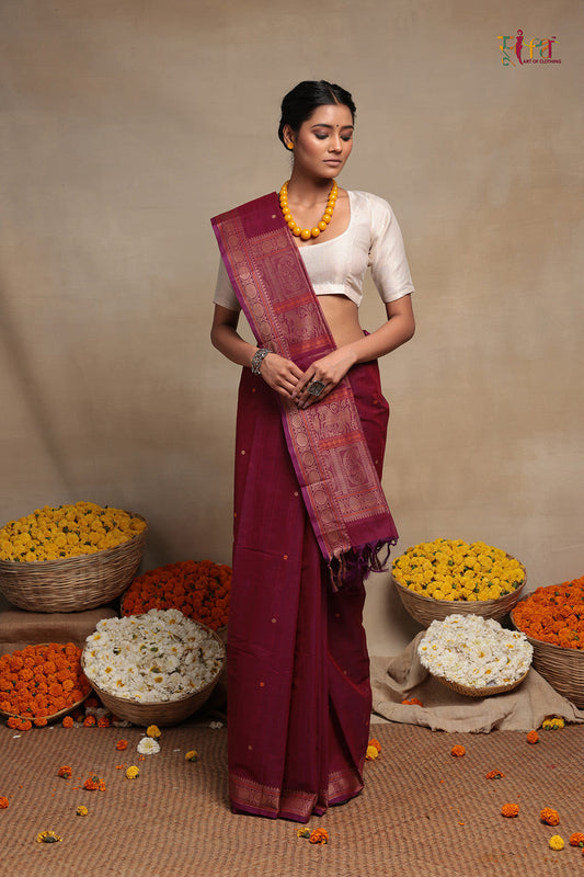 Pure gold and silver zari are integral to the weaving process, with silver zari woven first and then coated with gold. Originally, these sarees were crafted as 9-yard drapes, but the introduction of the 6-yard variant gained widespread popularity over time.