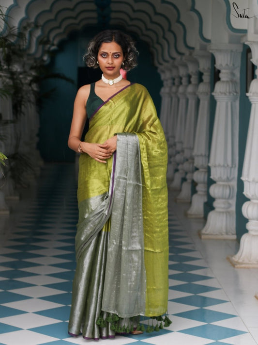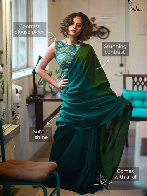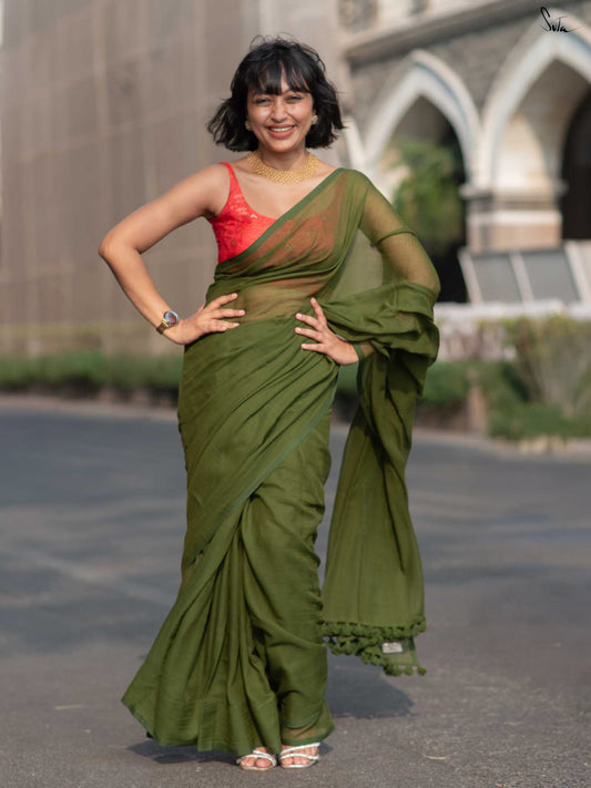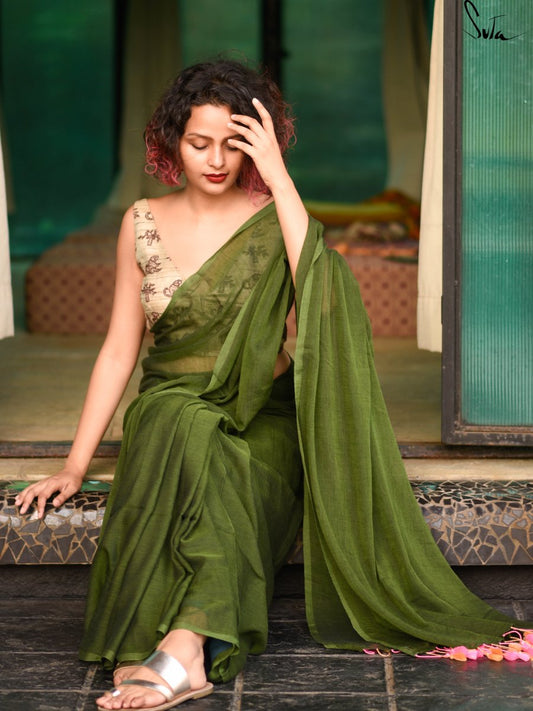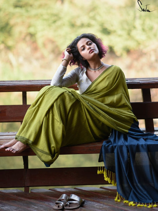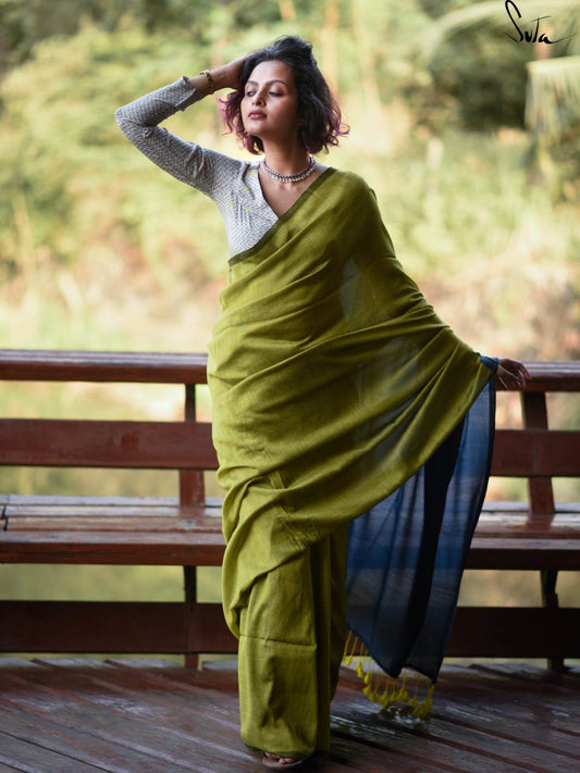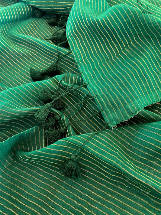 10% off availableHara rang | Deep green handloom cotton saree with zari stripes