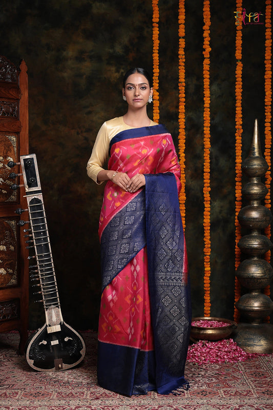 Bishnupuri Pochampally Ikkat Silk Saree in German Blue and Hot Pink