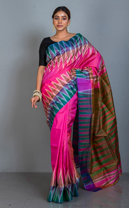 Bishnupuri Double Ikkat Pure Silk Saree in Rose Pink, Green and Multicolored