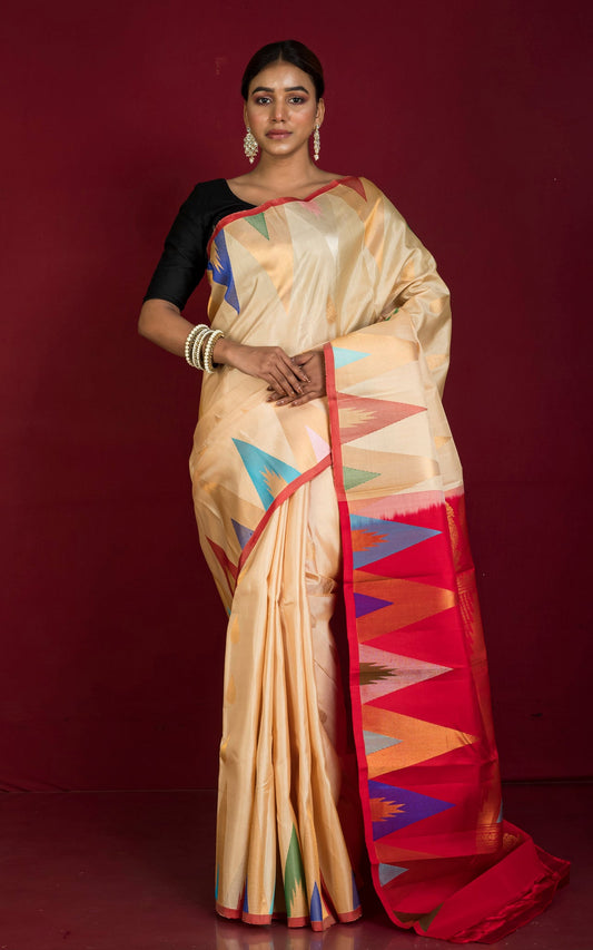 Exclusive Mahapar Crowned Temple Border Gadwal Silk Saree in Parmesan, Red, Golden and Multicolored Weave