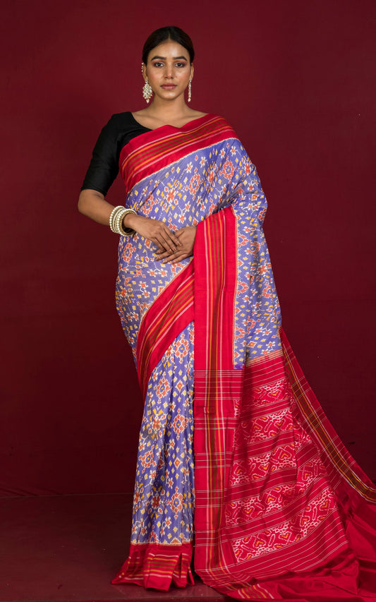 Exclusive Madathasu Ikkat Pochampally Silk Saree in Purplish Blue, Red, Amber Yellow, Off White and Black