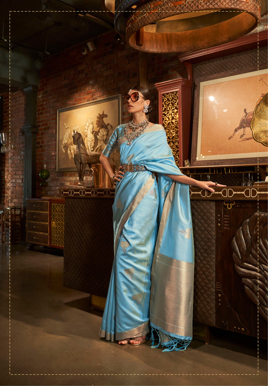Sky Blue-Mustard Yellow Color Golden Zari Banarasi Raw Silk Saree