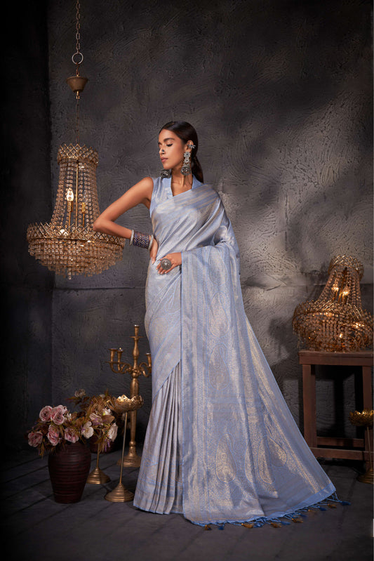 Slate Grey Color Silver Design Zari Kanjeevaram Silk Saree