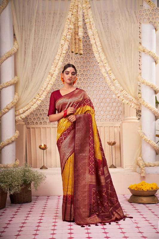 out of stockYellow Golden Zari Banarasi Satin Silk Saree