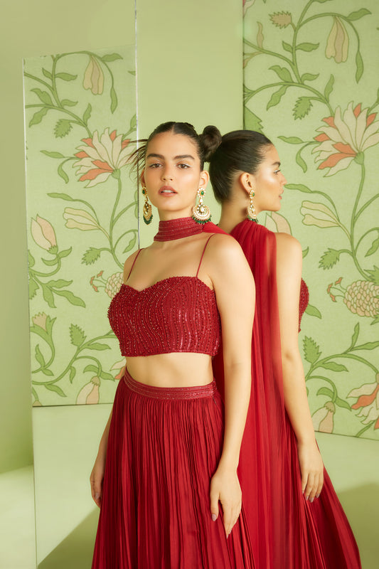 out of stockCherry Red Modal Satin Hunar Bridesmaid Lehenga
