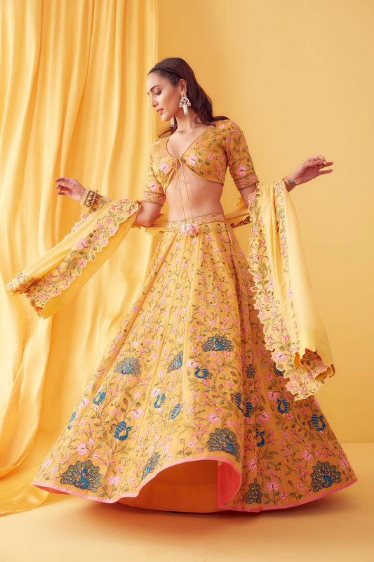 Mustard Peacocks In Lotus Garden Lehenga Set - Aarambh