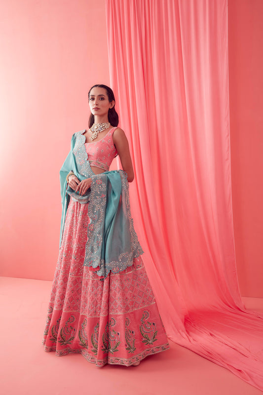 Pink Satin Hand embroidered Bridesmaid lehenga - Utsav with Mughal Motifs - Aarambh