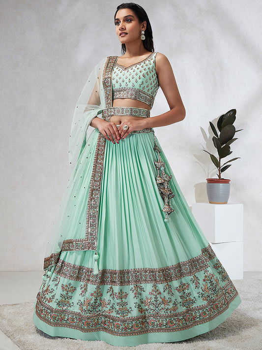 Teal Blue Color Sequins Zari Embroidery Lehenga