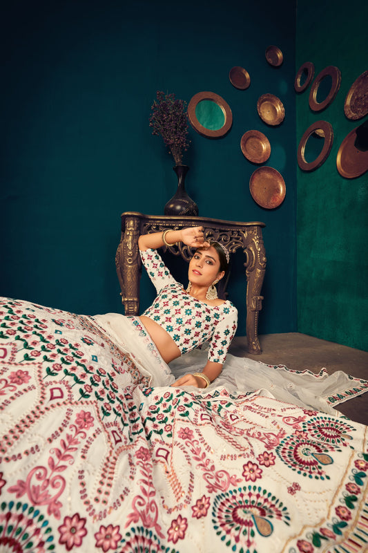 White Cotton Thread Embroidered Navratri Chaniya Choli