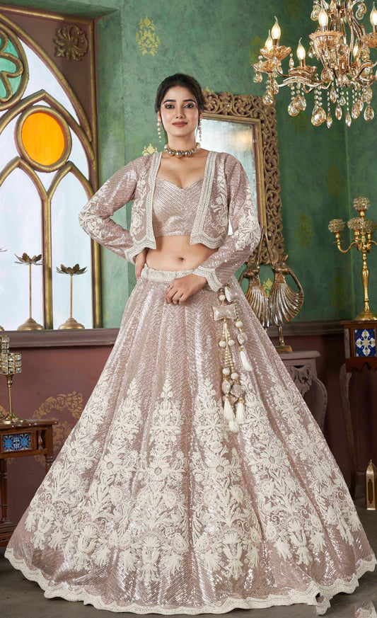 Beige Satin Silk Sequins Embroidered Ready to Wear Lehenga Choli
