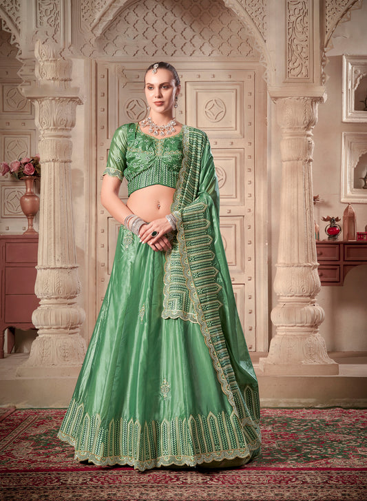 Mehendi Green Organza Zari & Resham Embroidery with Cow Motifs Lehenga for Bride