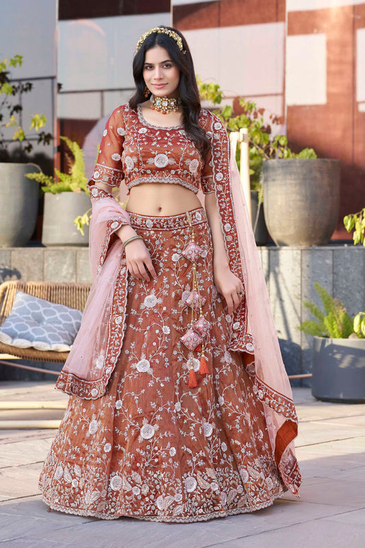 Rust Orange Silk Wedding Lehenga with Leaf Embroidery & Peacock Motifs