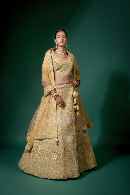 Designer Mustard Raw Silk and Organza Hand Embroidered Bridal Lehenga