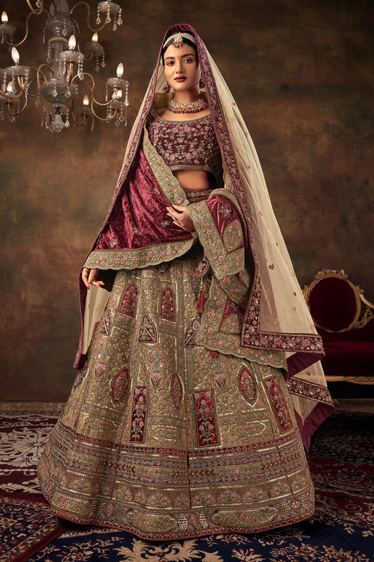 Maroon & Yellow Hand Embroidery Velvet Bridal Lehenga for Wedding