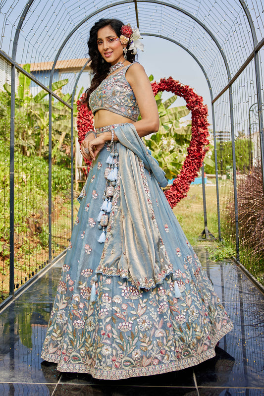 Ice Blue Soft Net Thread Embroidered Wedding Guest Lehenga