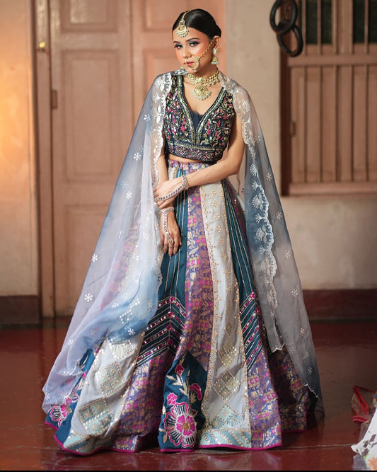 Blue and Beige Silk Aari Mirror Work Bridal Lehenga