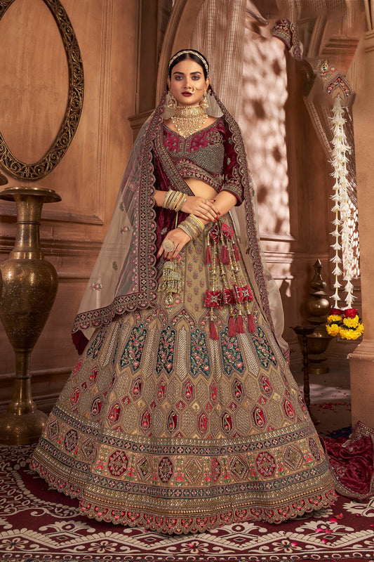 Brown & Maroon Hand Embroidery Silk Bridal Lehenga